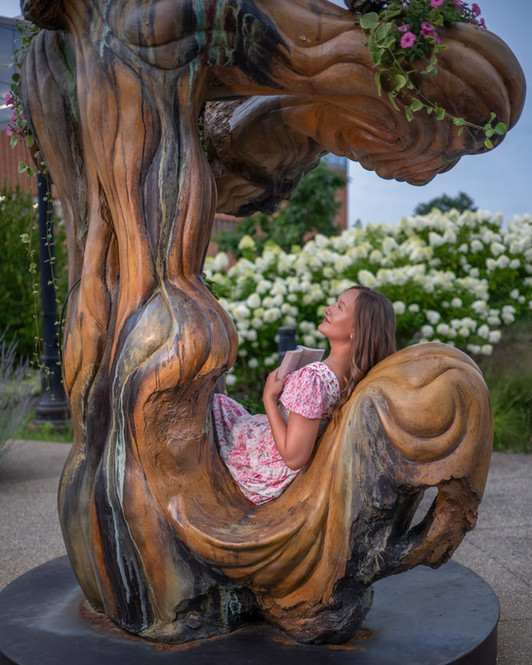 This next part of Madyson’s shoot had us feeling like we’d stepped straight into Alice in Wonderland after she tumbled down the rabbit hole. We stumbled upon the most enchanting little nook—it was unique, whimsical, and almost too perfect to be real. A piece of art doubled as the perfect reading spot, tucked among blooms and surrounded by nature, and it immediately felt like it was made just for her. Madyson slipped into the scene so effortlessly, like the true book-loving princess she is. With her elegance, grace, and love of stories, she floated through the space as if she belonged in her very own fairytale. Capturing her here felt magical—not just because of the beauty around her, but because it reflected the things that make Madyson her.